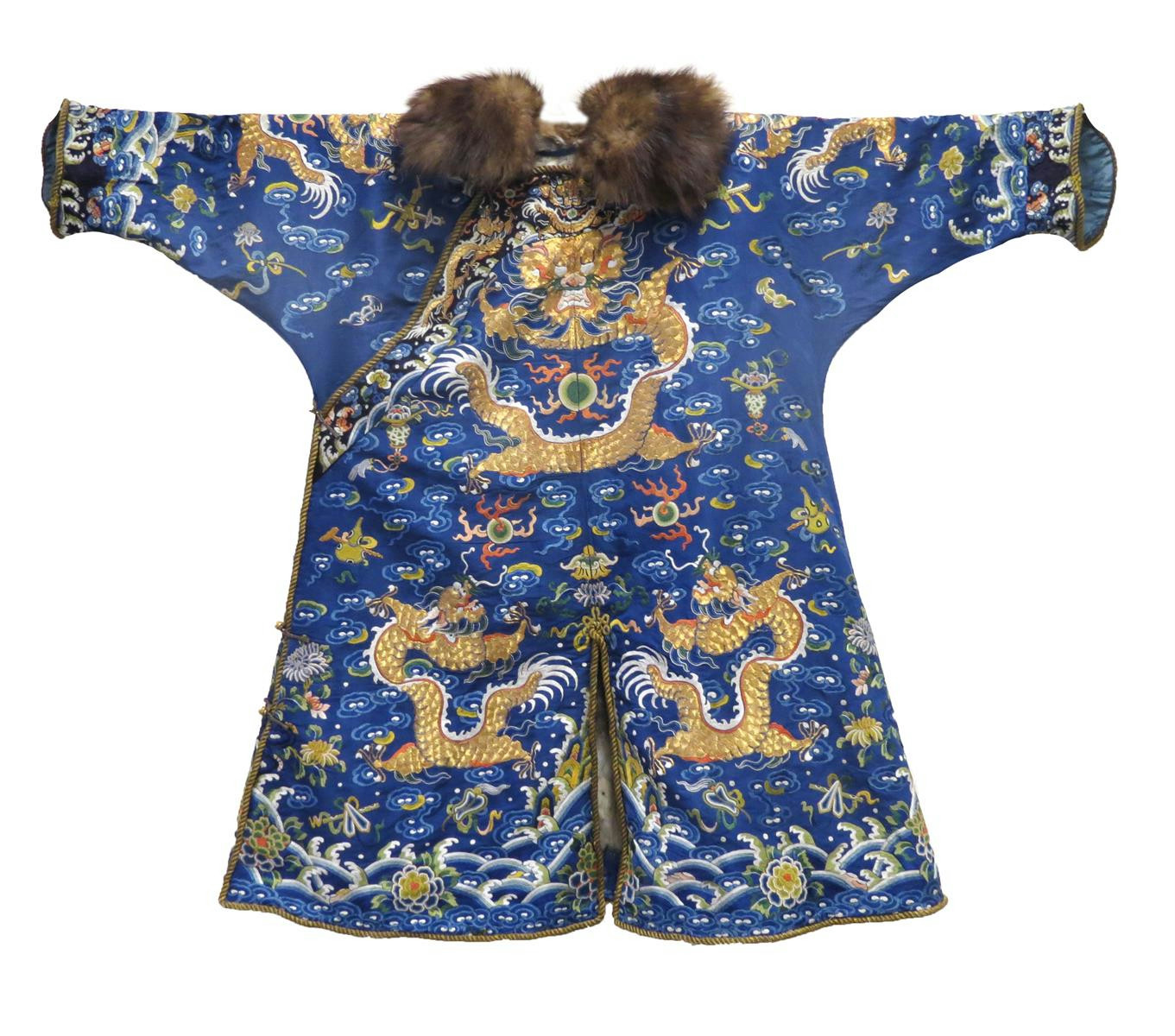 A small Chinese Winter dragon robe late Qing, fur-lined and with a fur collar, decorated with eight dragons, cloud scrolls, bats, vases and other auspicious things, all reserved on a blue ground, 134cm across.