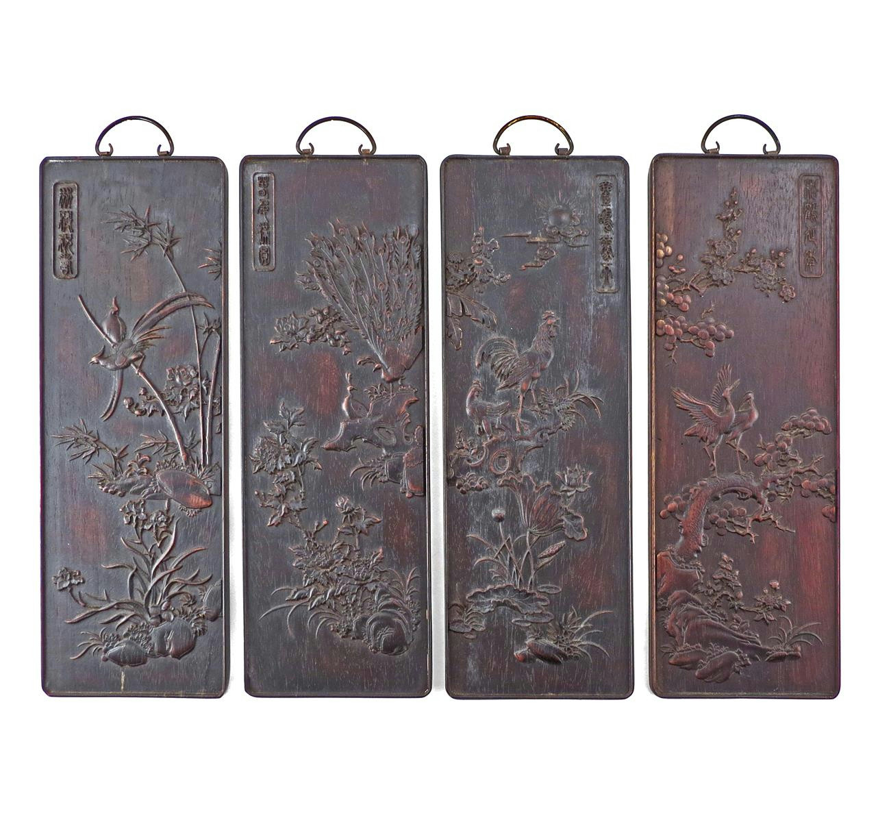 A set of four Chinese hardwood panels late Qing dynasty/Republic period, each depicting pairs of birds with rockwork and trees, one with birds of paradise, another cranes, another peacocks, the fourth a cockerel and hen, each with an inscription, 48.5cm x 16.5cm. (4)