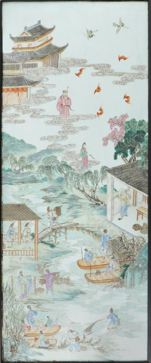 A large Chinese famille rose rectangular porcelain plaque 19th century, depicting fisherfolk in the foreground, their faces upturned towards two Immortals floating on clouds, with five bats and two cranes in flight, 94cm x 38cm.