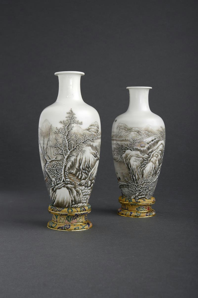 A pair of Chinese eggshell porcelain vases Republic period, each painted with wintry scenes of figures in a small boat and crossing a bridge in rocky watery landscapes, each shoulder with an inscription describing the scene and a signature for Zhou Xuan, the bases marked Wan Yan, raised on a fitted silk base and with a fitted box, 14cm. (5)
