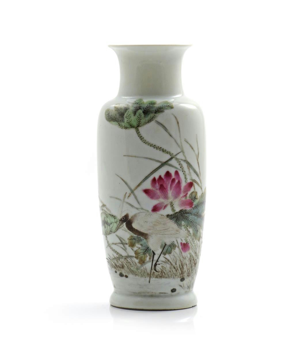A Chinese famille rose vase Republic Period, painted with an egret at the water's edge, with a large lotus flower emerging from leafy foliage, an inscription to one side for Bi Bo Tao, the base with a mark which reads nan chang cheng xing sheng zhi, 22.2cm.