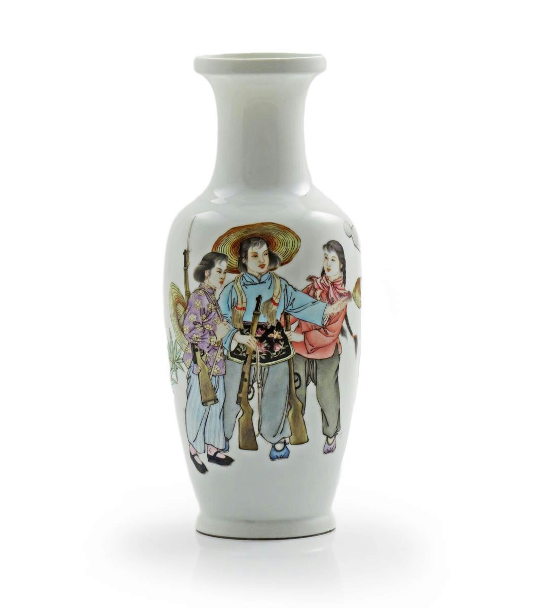 A Chinese famille rose vase Republic period, depicting female soldiers from the Second Sino-Japanese War (1937-1945), conversing and carrying weapons, the base with a mark which reads Jing De Zhen zhi, 29.2cm.