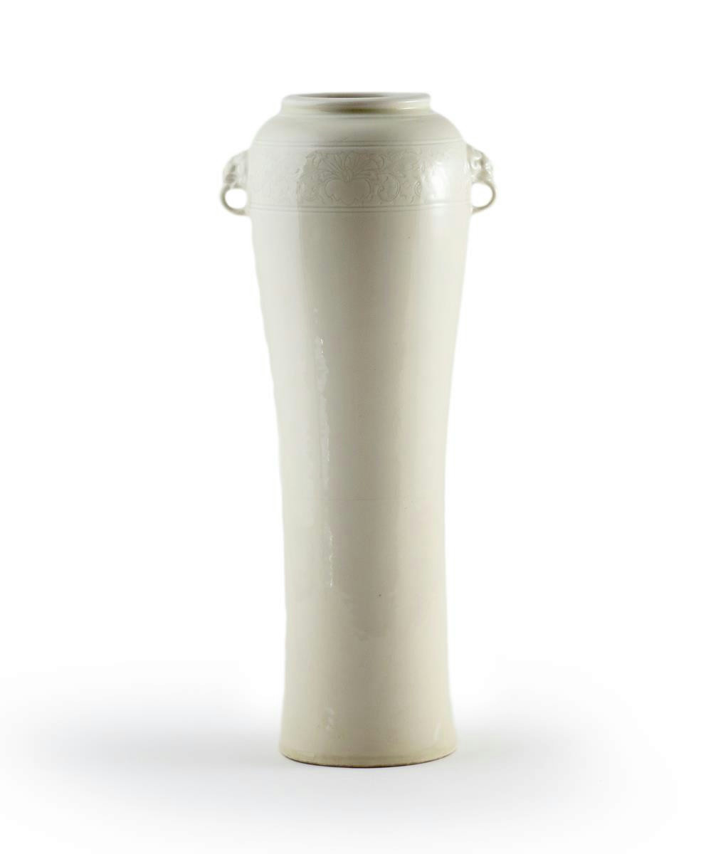 A large Chinese blanc de Chine vase 19th century, the tall ovoid body with a gently flared foot, incised with a band of scrolling foliage to the shoulder, and with two loop animal mask handles, 40cm.