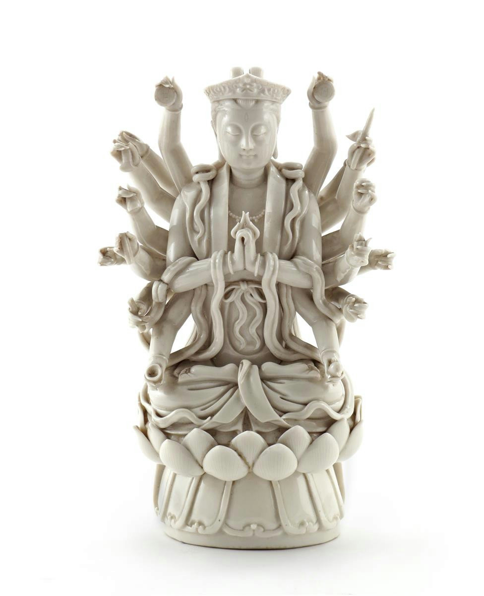 A Chinese blanc de Chine model of Guanyin late Qing dynasty, seated on a double lotus base, with her thousand arms raised around her holding various attributes, her robes adorned with ribbons, an impressed seal mark to the reverse which reads Lin Xiao Zong, contained in a fitted box, 25cm. (2)