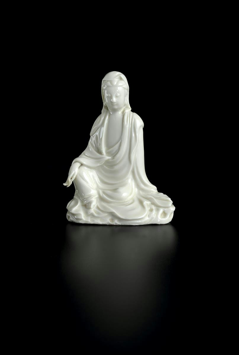 A Chinese blanc de Chine model of Guanyin 17th century, seated on a low rocky plinth wearing flowing robes, her right knee raised with her hand resting upon it, her face down-turned with a serene expression, 14cm.