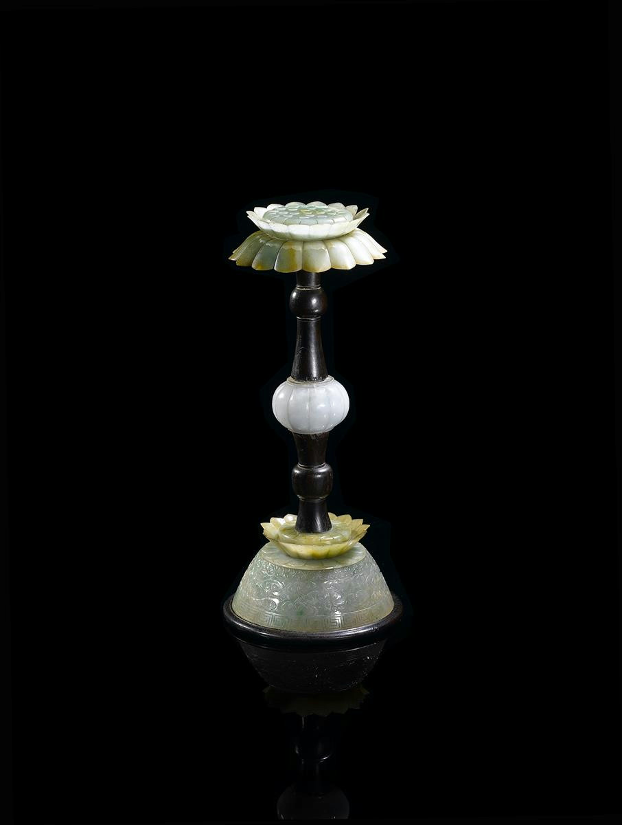 A rare Chinese Imperial jadeite and zitan hat stand 19th century, constructed in sections, the domed base carved in shallow relief with bats amongst cloud scrolls above a band of key fret, the flowerhead-shaped hat rest carved with two layers of petals, the flaring knopped zitan supports separated by a large central segmented ovoid jade bead, all contained within a fitted zitan box, the stand 28.5cm overall. (2)