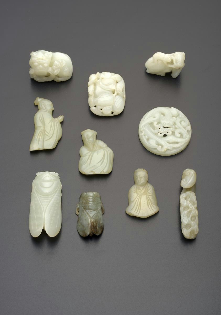 Ten small Chinese pale celadon jade carvings 18th/19th century, variously carved, comprising: two cicadas, three appliqués formed as figures, a bi disc, a Buddhist lion dog, a horse with a money, a lingzhi-shaped belthook and a reticulated plaque carved as fruit, 7.5cm. (10)