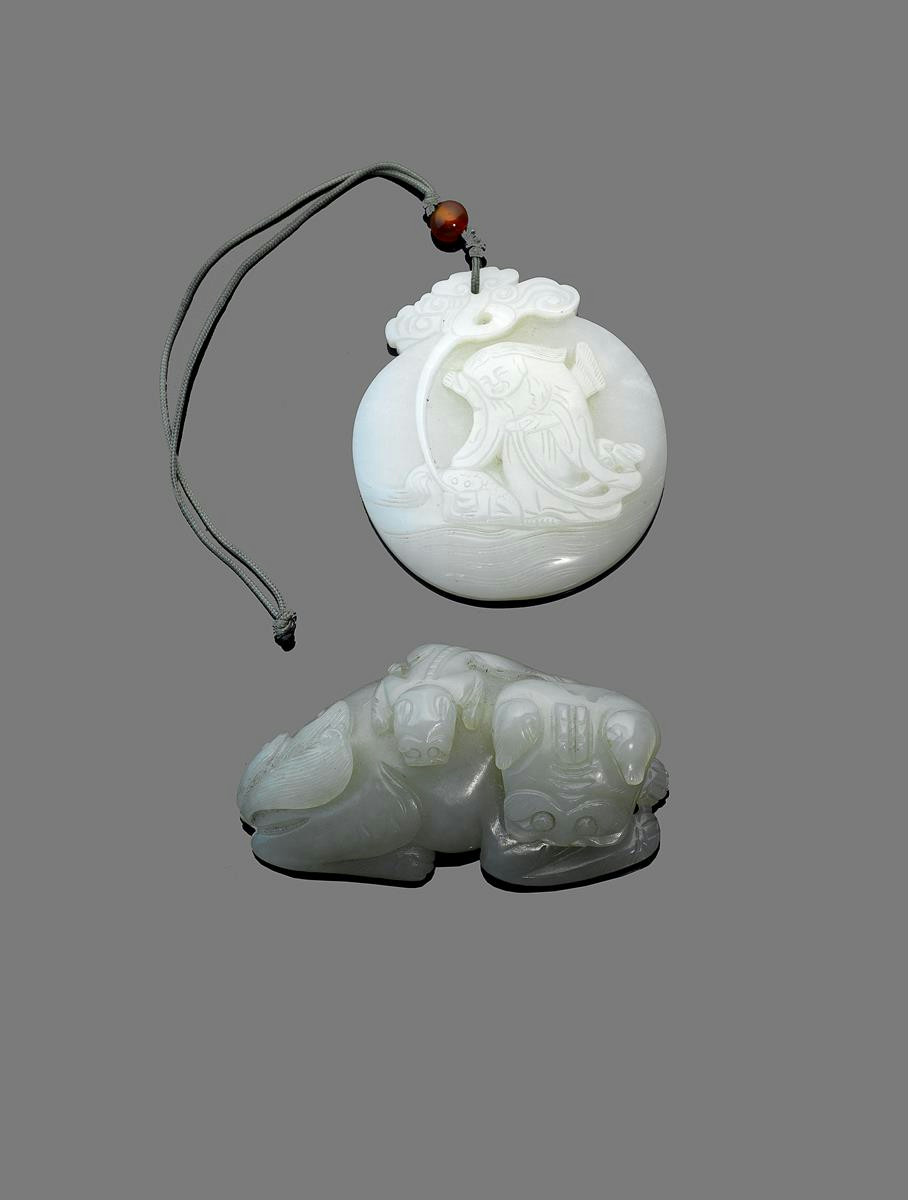 Two Chinese celadon jade carvings 18th/19th century, one carved as a Buddhist lion dog and her puppy, the other with Liu Hai and his toad, the reverse with a flowering lotus, 6.8cm. (2)