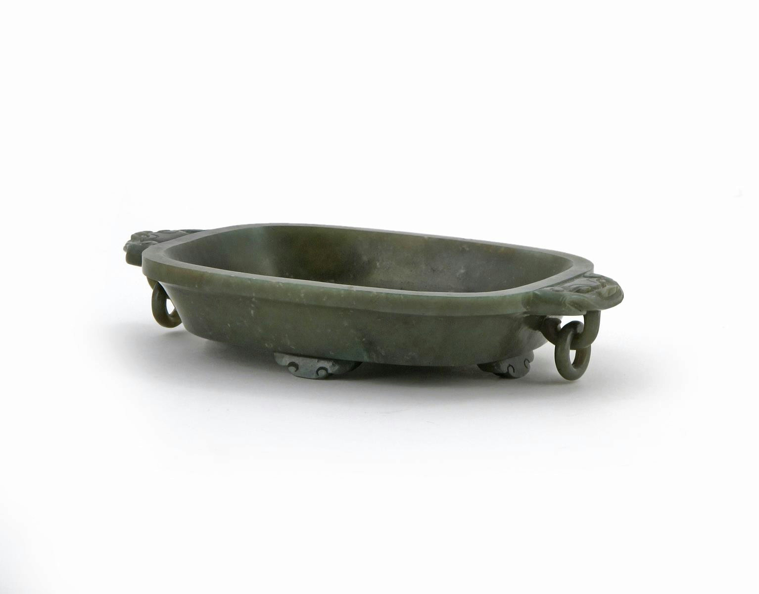 A Chinese spinach-green jade shallow jardinière 19th century, carved with flattened animal mask handles with loose rings to each end, the gently flared body raised on four short ruyi-head-shaped feet, the stone flecked with celadon, 27.3cm.