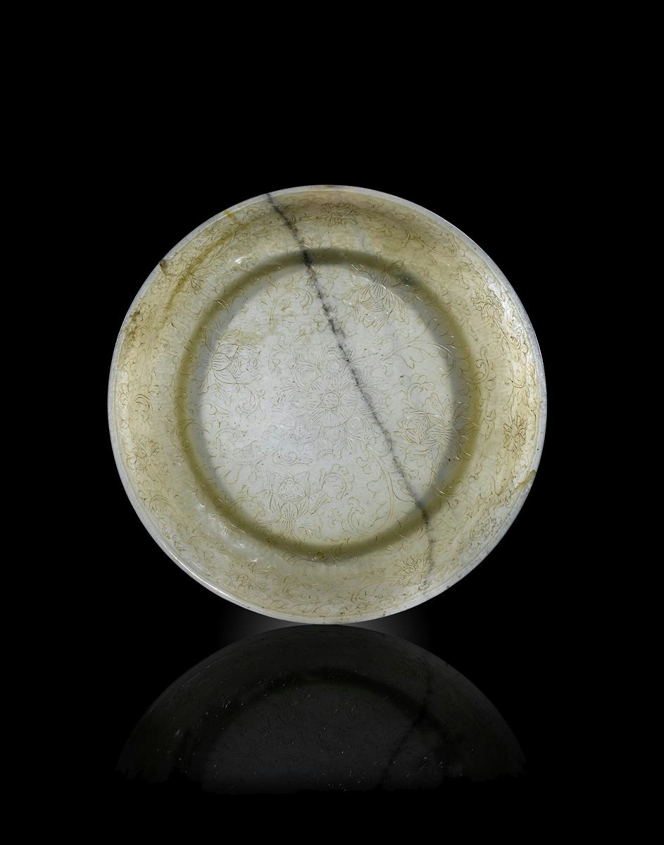 A large Chinese celadon jade dish four character Qianlong mark and of the period 1736-95, carved in shallow relief with a scrolling foliate lotus design encircling a central flowerhead motif, the flared body raised on a short straight foot, the stone with a single grey striation, 26.6cm.