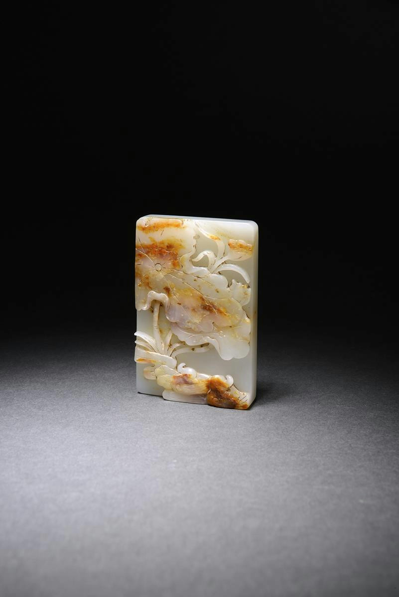 A Chinese white jade rectangular plaque 19th or 20th century, carved in relief to one side with two Mandarin ducks swimming beneath an enormous lotus plant, to the other with two quail beneath millet, a four character mark which reads sui sui ping an, the stone with russet striations, 6.2cm.