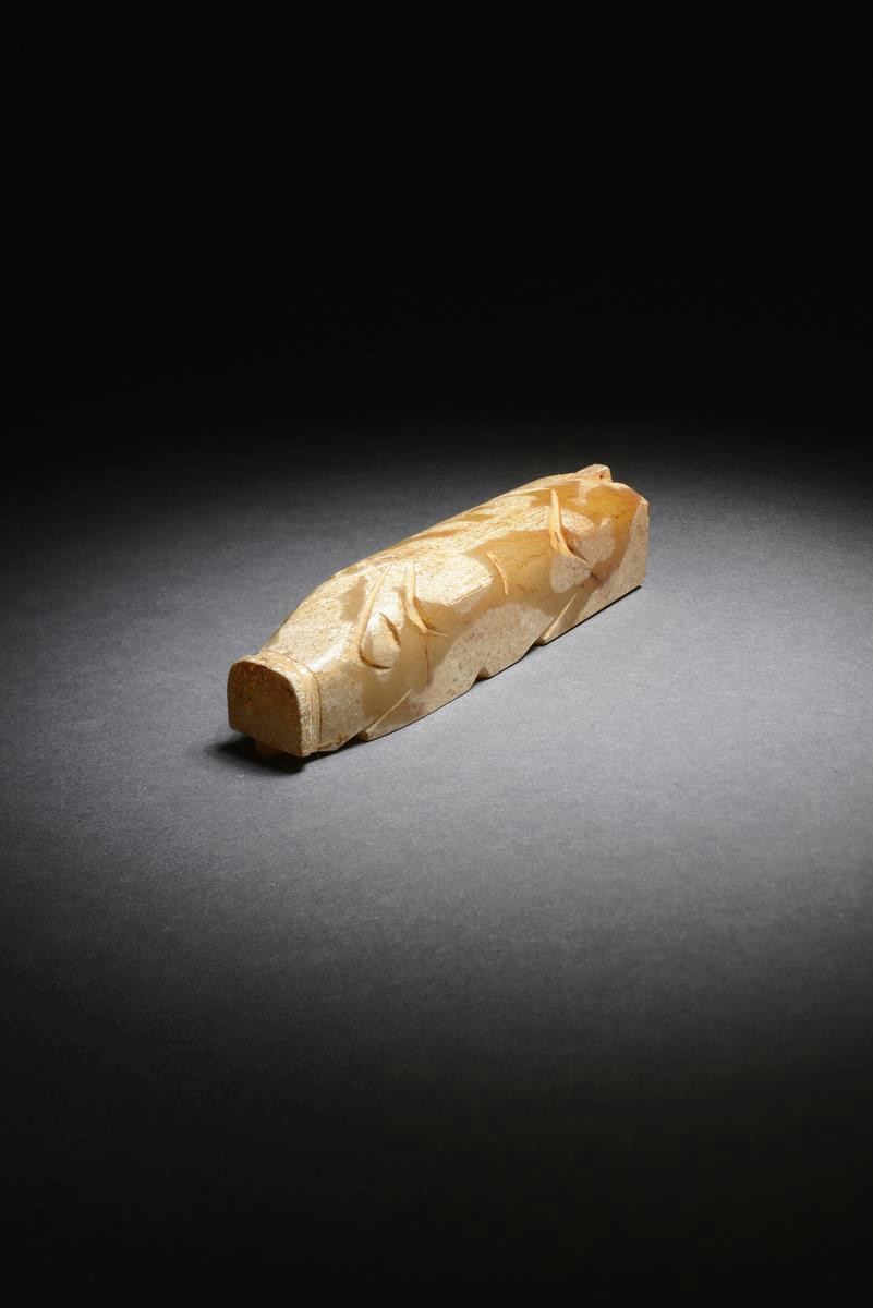 A Chinese russet jade carving of an archaistic pig, tun Han or later, the oblong body with a stylized snout, the stone with cloudy-white striations, 8.8cm.