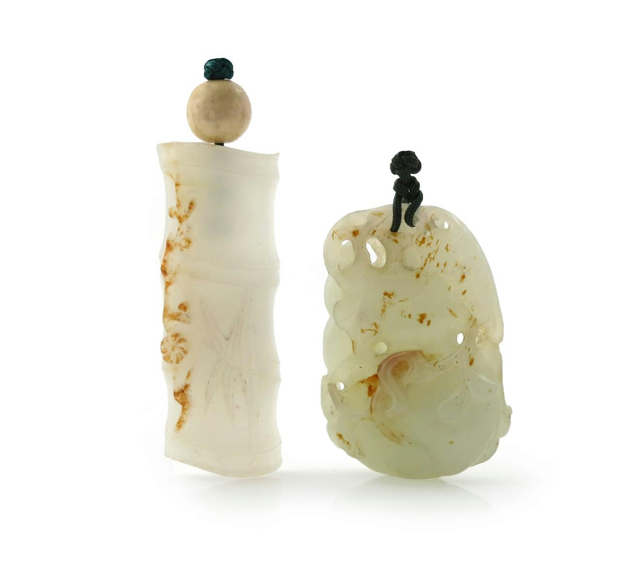 Two Chinese pale celadon jade carvings 19th century, one naturalistically carved as a section of bamboo, with a smaller plant emerging from the base and a flowering tendril to one side, the other carved as two gourds issuing from a leafy tendril, a bat clambering upon the larger fruit, the stones with russet markings, 6.5cm max. (2)