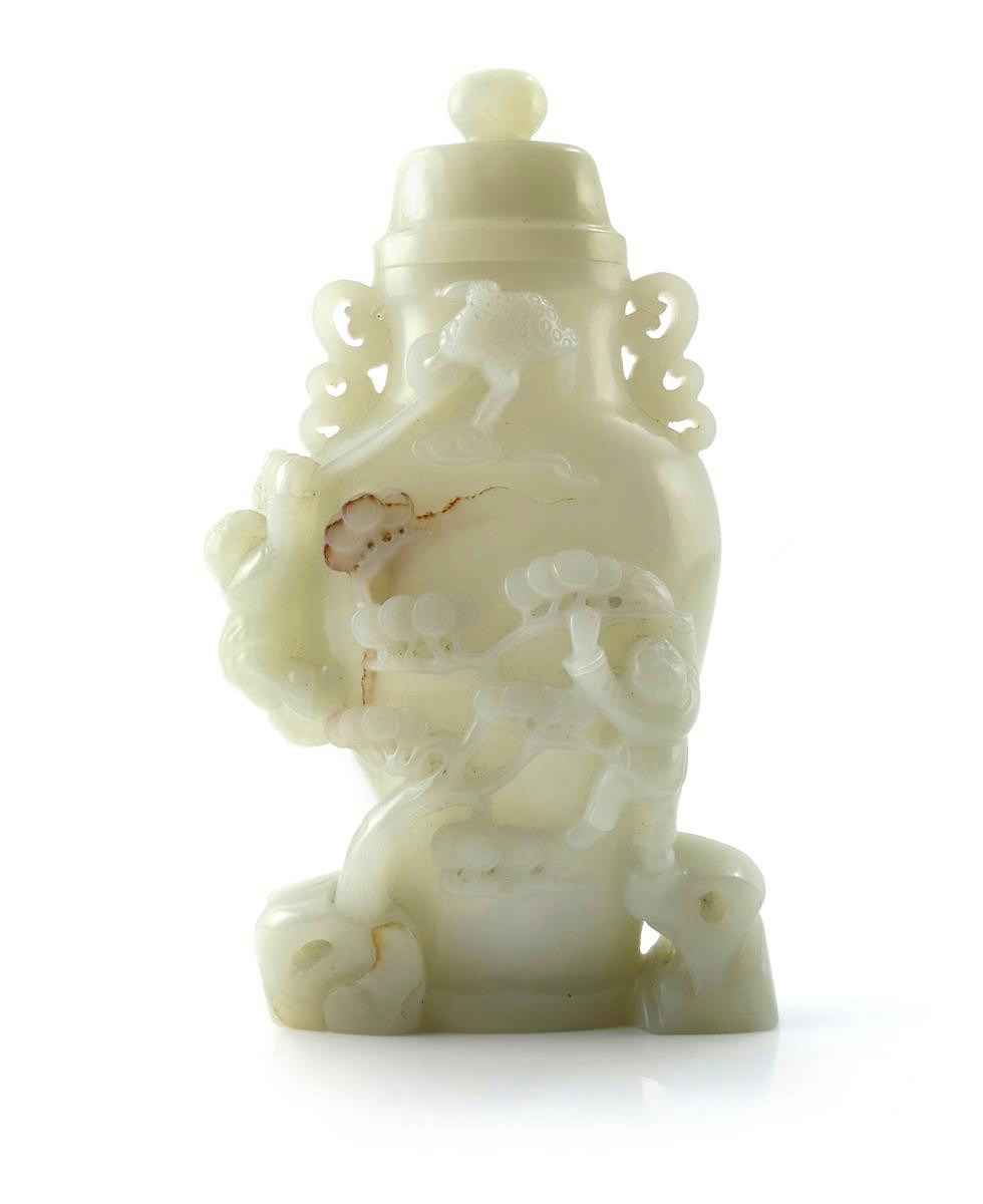 A Chinese pale celadon jade vase and cover 19th century, carved with two boys clambering upon a money tree, and with Liu Hai's three-legged toad holding a coin in his mouth, the shoulder with scroll handles, the cover with a ball knop, 18.2cm. (2)