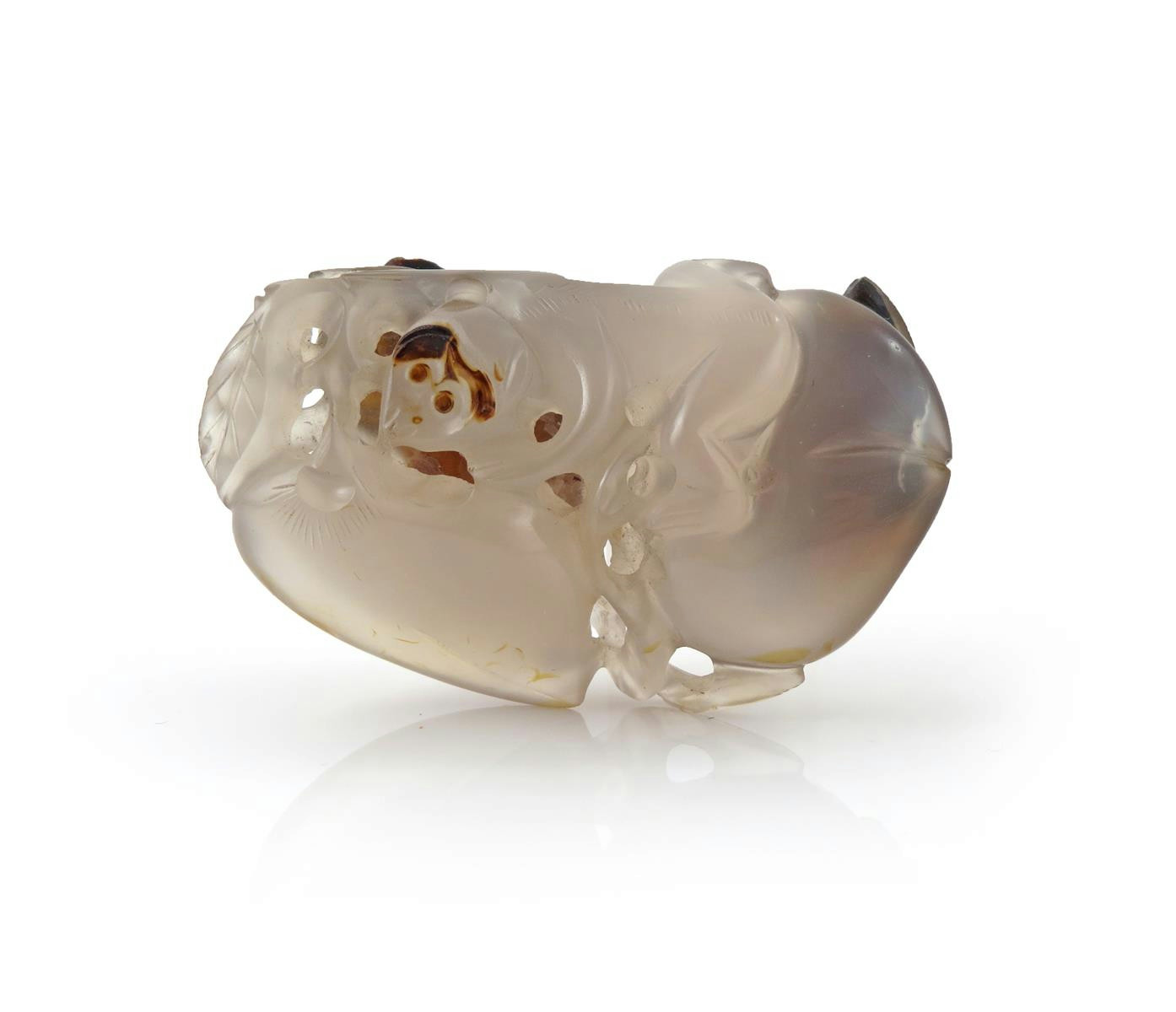 A Chinese agate carving of two peaches 18th/19th century, issuing from a leafy stem, a monkey clambering along the top, a cicada and a butterfly carved from darker stone to the reverse, 5.2cm.