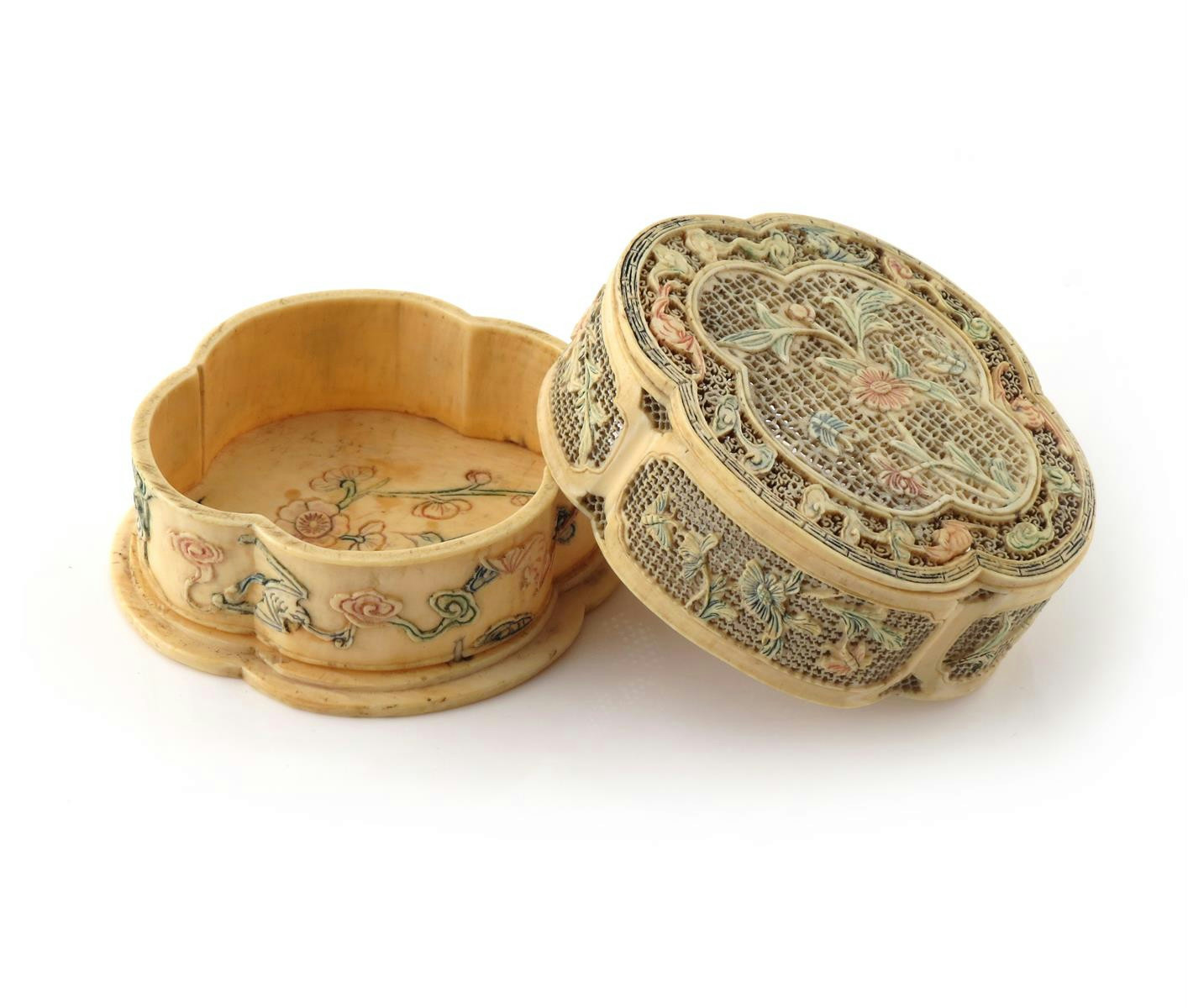 λ A Chinese polychrome ivory quatrefoil box and cover 18th century, the reticulated cover delicately carved with a panel containing chrysanthemum and butterflies, encircled by bats and clouds, with further panels of fruiting and flowering sprays, the base carved in relief with bats amongst clouds, a bird beside prunus to the interior, 7.5cm. (2)
