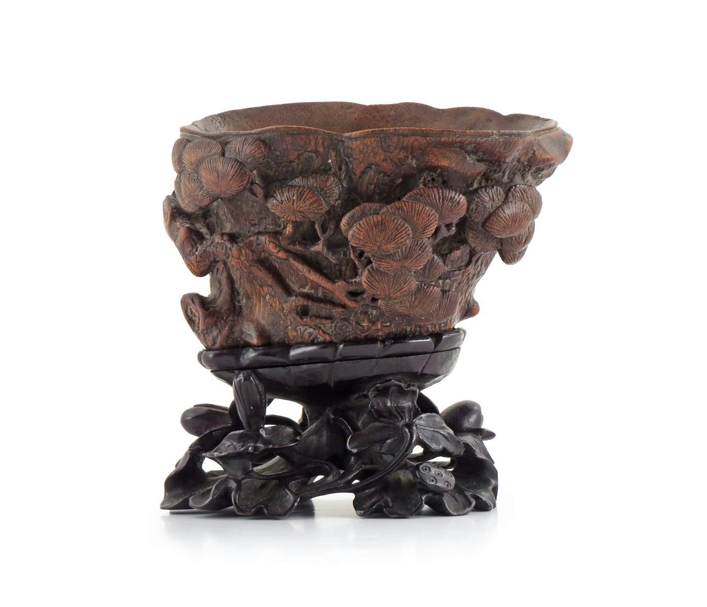 A Chinese bamboo carved libation cup 17th/18th century, modelled as a large pine tree trunk, with gnarled leafy branches extending around the exterior, raised on an elaborately carved hardwood stand, reticulated with lotus leaves and flowers, 16.2cm. (2)