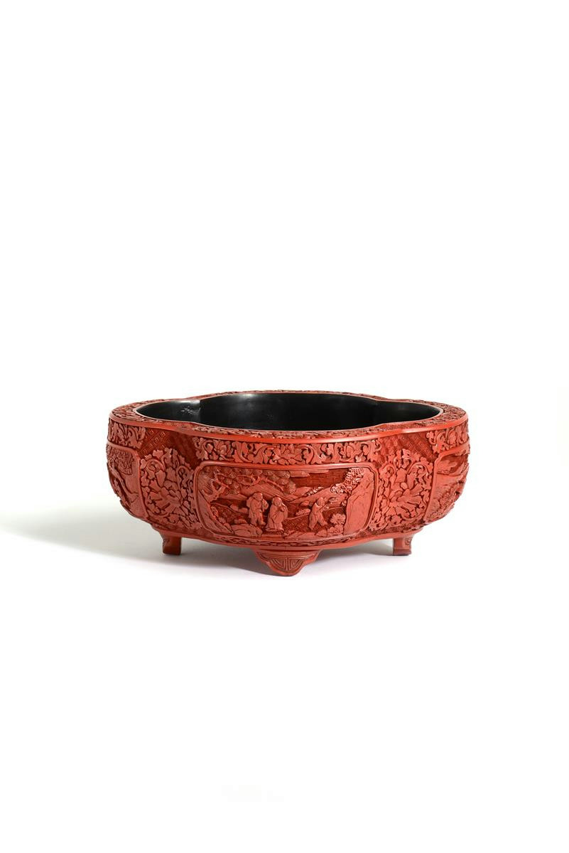 A Chinese red cinnabar lacquer quatrefoil jardinière 18th century, carved in relief to the exterior with four rectangular panels, each depicting Shoulao in a rocky garden with two attendant boys amidst trees and rocks, with elaborate scrolling foliate lotus borders reserved on a cell diaper ground, the body raised on four short ruyi feet, 21cm.