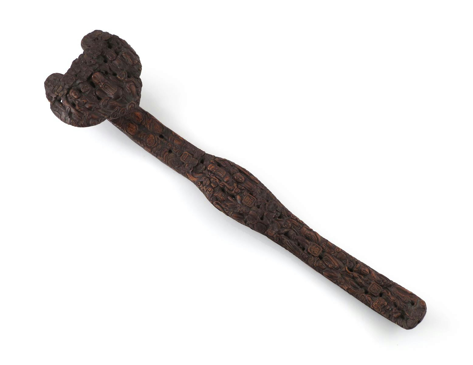 A large Chinese aloeswood ruyi sceptre 19th century, carved with Shoulao seated with a peach to the ruyi-shaped terminal, the seven other Immortals amongst pine, bamboo and clouds to the shaft, and with four characters depicting the phrase yi pin dang chao (to be the highest court official), 59.5cm.