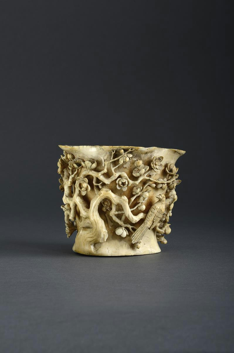 λ A Chinese ivory libation cup 18th/19th century, elaborately carved with an openwork gnarled flowering prunus tree, with two magpies perched in its branches, 13.5cm dia.
