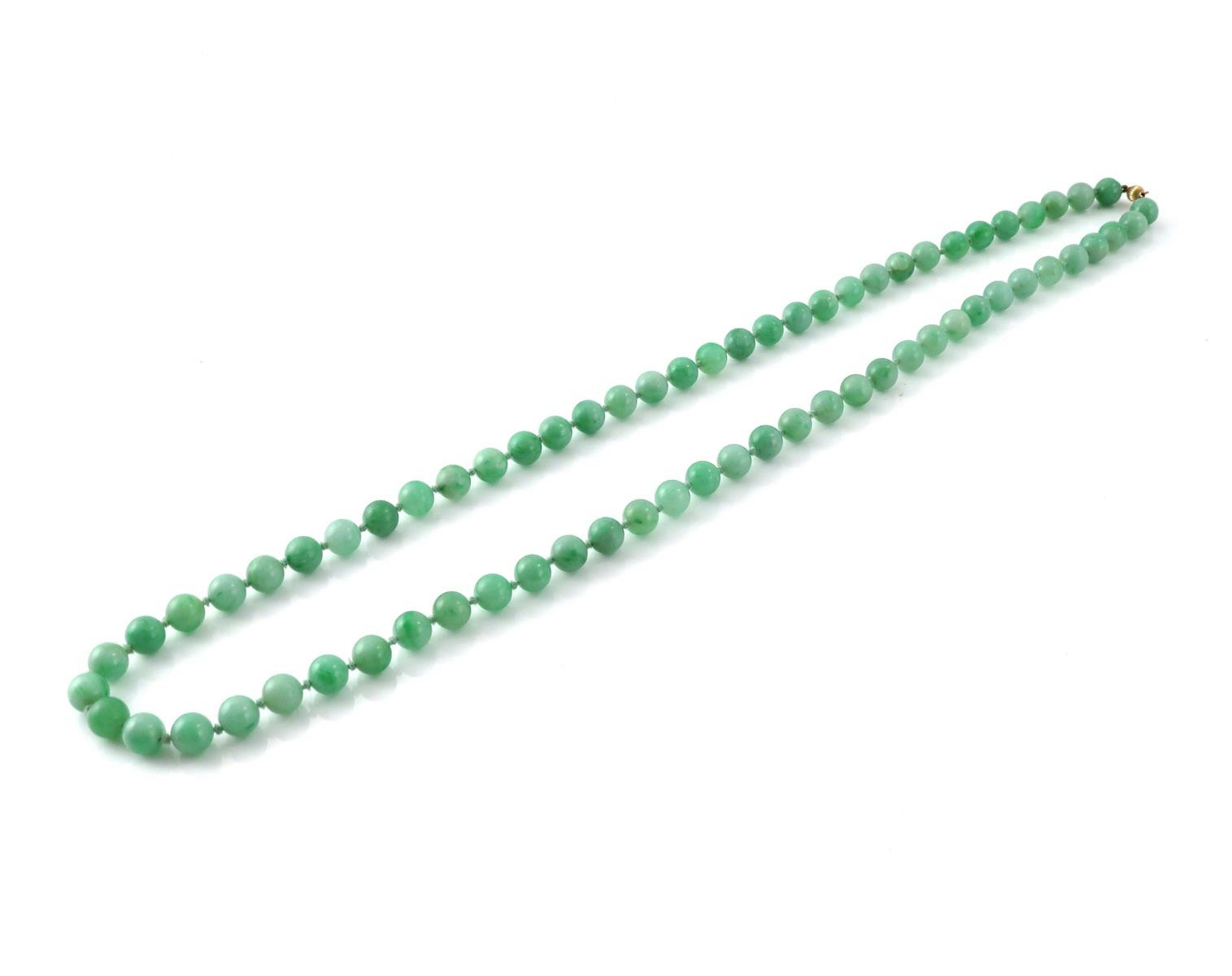 A Chinese jadeite bead necklace 20th century, the circular beads joined by a gilt metal clasp, 39.5cm.