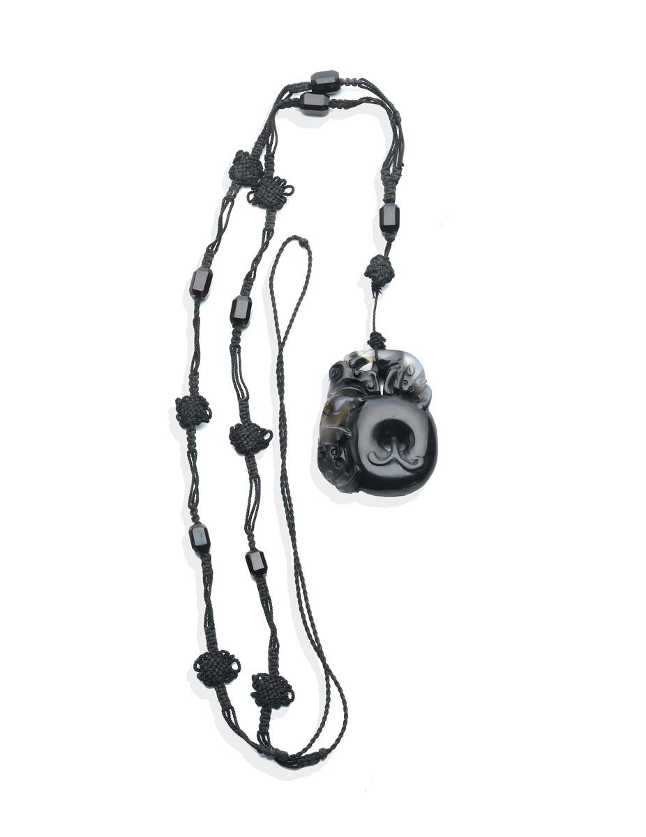 A fine Chinese agate pendant 18th/19th century, carved with two cats climbing around a large ring, through which a scrolling tendril extends, the stone varying from black to a translucent pale grey, 5cm.
