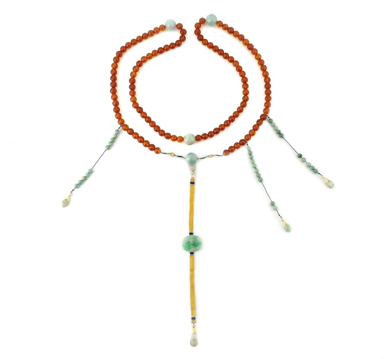 A Chinese amber and jadeite bead court necklace, chao zhu 20th century, with 108 amber beads separated by three jadeite large beads, 142cm overall.