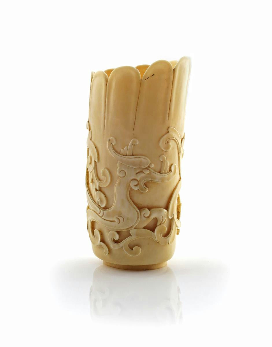 λ A Chinese ivory vase 18th century, carved in shallow relief with a stylized sinuous dragon encircling the oval body, the rim asymmetrically lobed, 10.5cm.