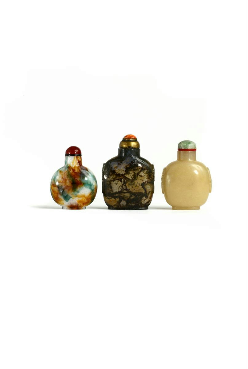 λ Three Chinese snuff bottles 19th century, one in moss agate, the stone in dark-green and brown tones, another pale brown-celadon jade, both carved to the shoulder with animal mask handles, the third glass, of plain ovoid form in russet, green and white, 8.2cm. (3)