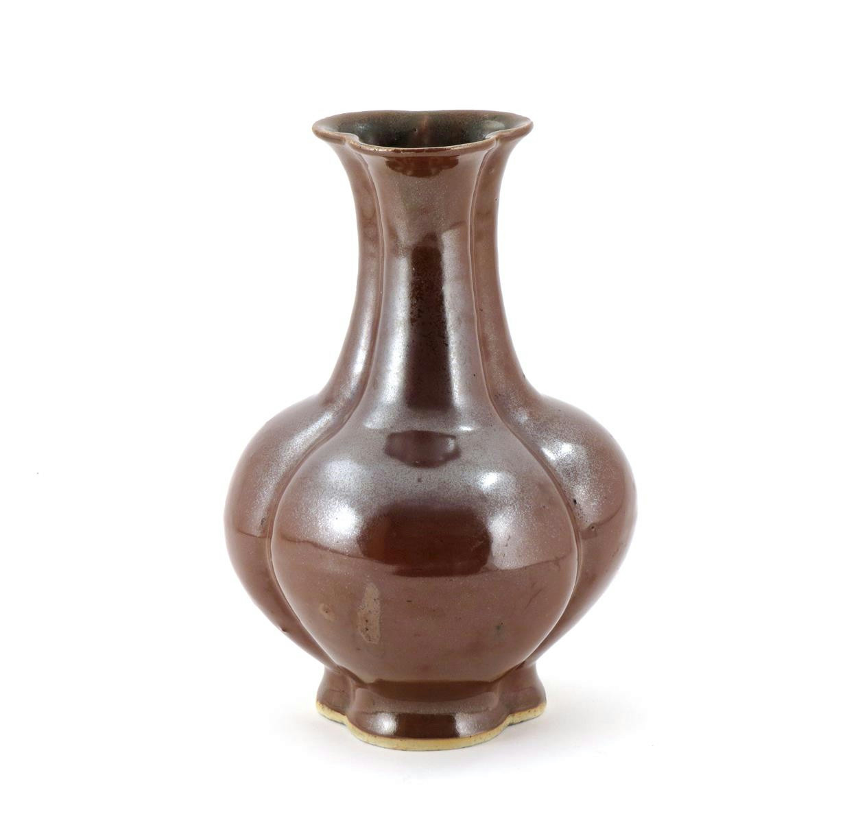 A Chinese lobed monochrome vase 18th/19th century, the bulbous body rising to a flared neckrim, decorated in an unctuous brown glaze, 24.7cm.