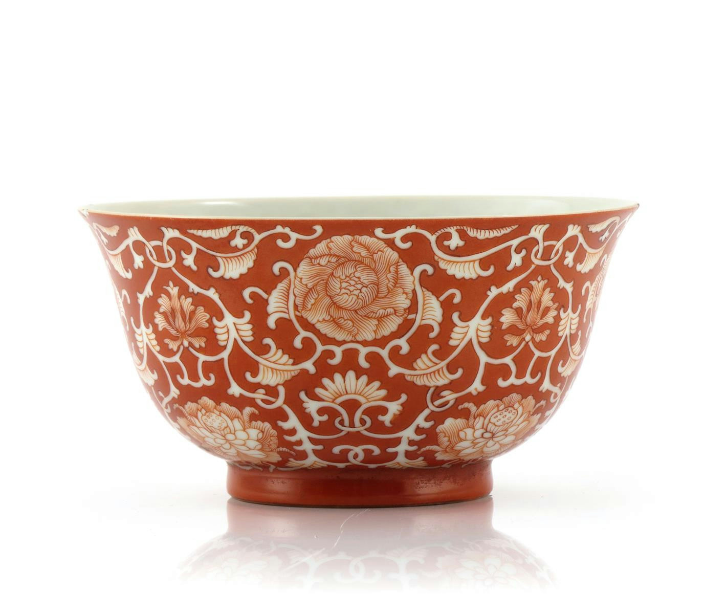 A Chinese iron-red reverse-decorated bowl six character Qianlong mark but possibly later