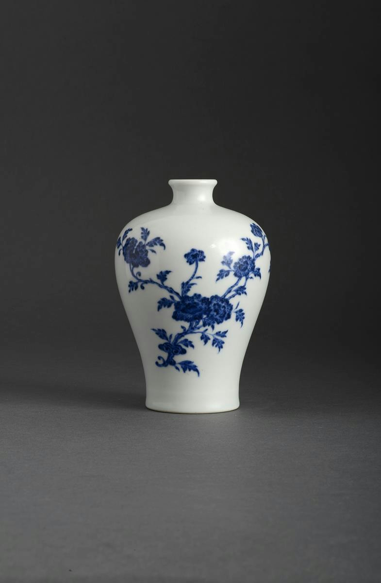 A rare Chinese small Ming-style blue and white meiping six character Qianlong mark and of the period 1736-95, with an ovoid body delicately painted in cobalt blue with chrysanthemum and peony issuing from lingzhi heads, 15.5cm.