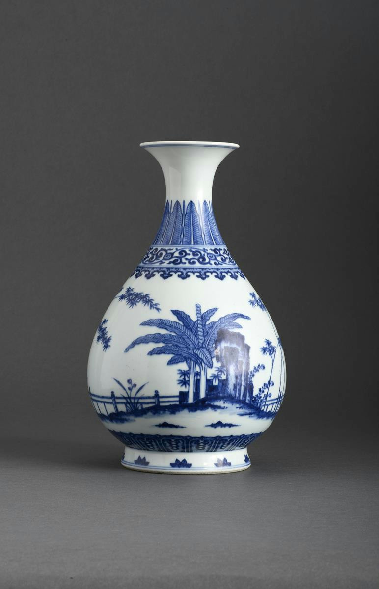 A Chinese blue and white bottle vase, yuhuchunping six character Qianlong seal mark and probably of the period, the pear-shaped body painted with a rocky fenced garden with plantain and bamboo, between bands of elaborate lappets, foliate scrolls and stiff leaves 28.5cm.
