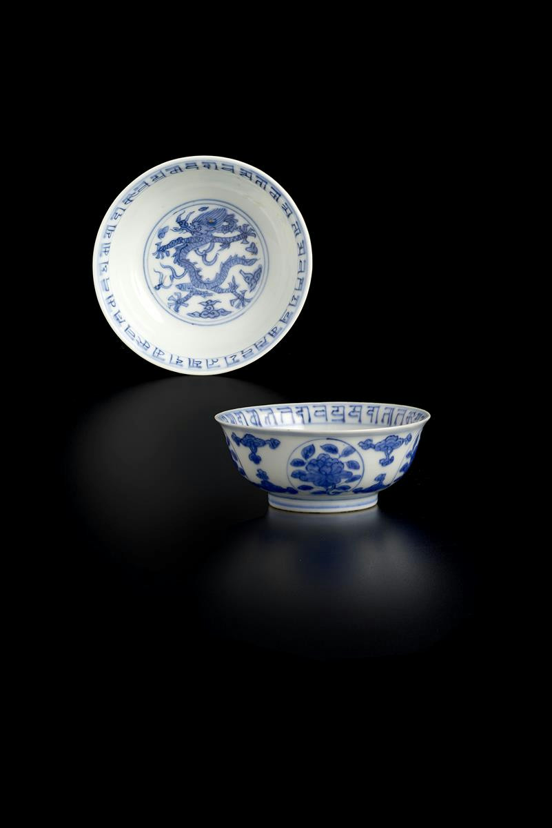 Two Chinese blue and white dragon bowls six character Wanli marks and of the period 1573-1620, each painted with a single five-clawed scaly dragon to the well within double concentric bands, the rim with a band of lança characters, the exterior with medallions of peony sprays divided by stylized ruyi, 9.8cm. (2)