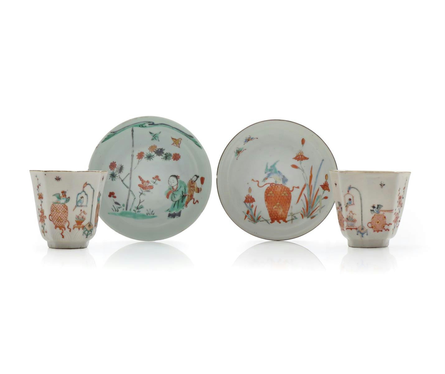Two blanc de Chine Dutch-decorated beakers c.1700, the flared octagonal forms moulded with leaf lappets, later-enamelled in the Kakiemon palette with alternate panels of birds perched on tall vases or baskets, smaller birds on perches and flowering prunus sprays, a Japanese saucer painted with the original Kakiemon design from which the beakers derive, and a rare Chinese saucer with Kakiemon decoration of two figures beside pine and peony, 11.7cm max. (4)