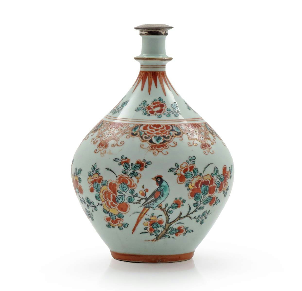 A rare Chinese porcelain Dutch-decorated hookah base late 17th century, originally left plain with a brown line to the knop of the neck, later-enamelled in red, green and black with pheasants perched on flowering branches, beneath a formal baroque border, highlighted in gilt, the shoulder with flower sprays beneath red stiff leaves, the neckrim mounted in silver, 23.5cm.