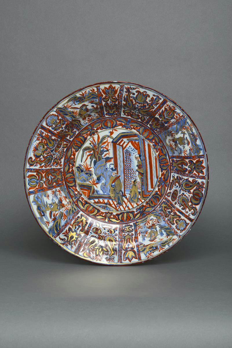 A massive Chinese porcelain charger mid 17th century, originally decorated in underglaze blue in the Kraak style with three figures in a doorway, the wide rim with panels of further figures and flowers, later-enamelled possibly in Holland in the Imari style with red and gilt highlights to the original decoration, 48.5cm.