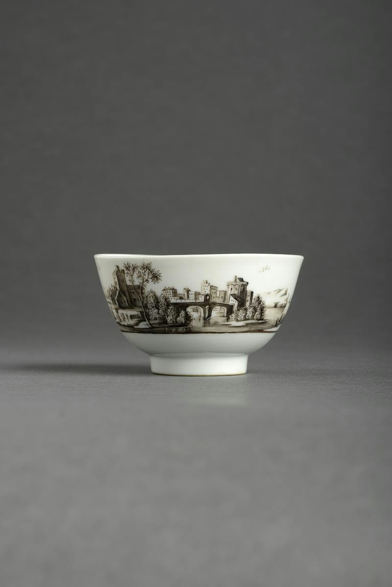 A Chinese porcelain German-decorated teabowl Kangxi 1662-1722, originally left in the white with an underglaze blue mark of a conch shell, later-enamelled en grisaille with a continuous harbour scene of boats and buildings amongst a winding river, 7.5cm dia.