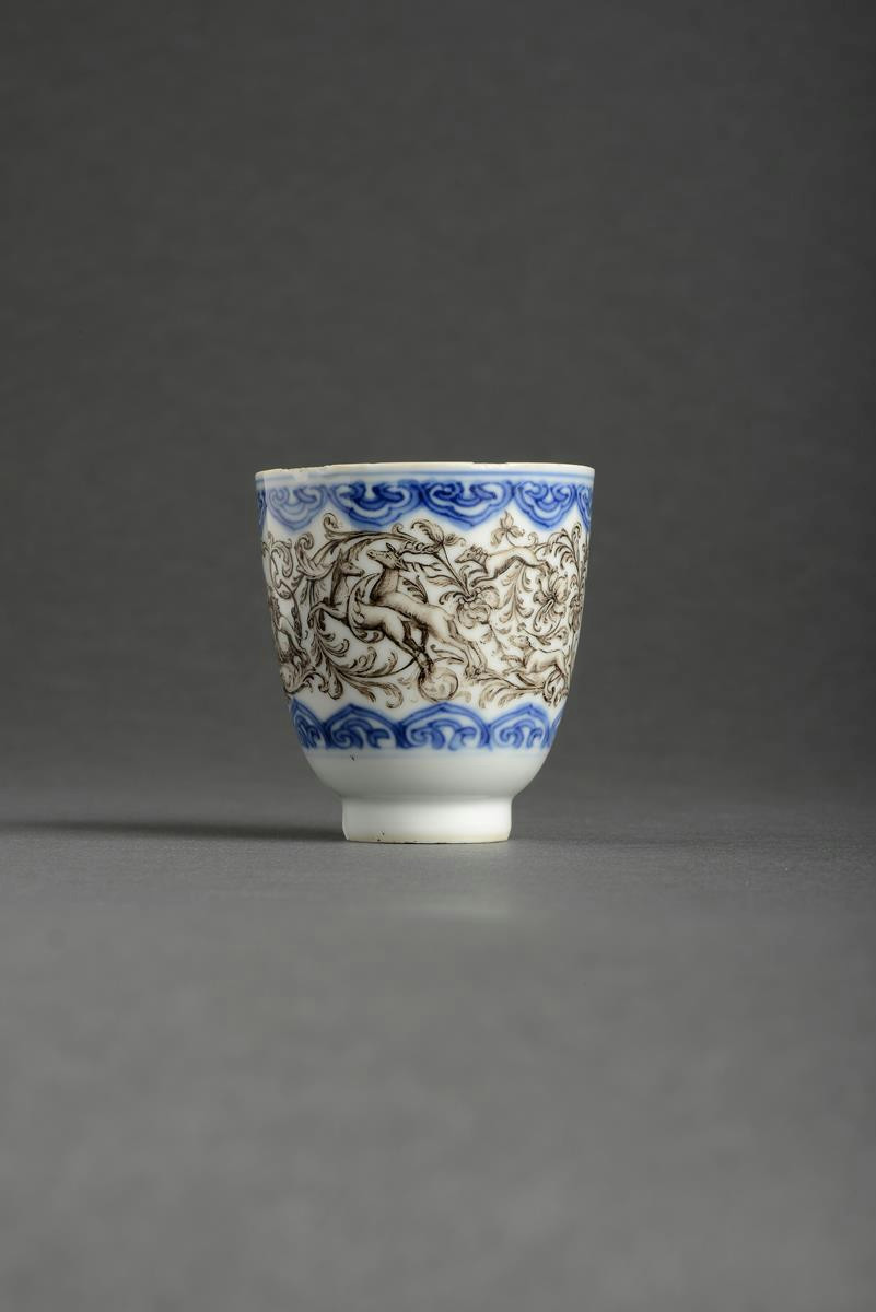 A small Chinese porcelain German-decorated beaker Kangxi 1662-1722, originally decorated with two bands of ruyi-heads in underglaze blue, later-enamelled in schwarzlot with a baroque panel of hounds attacking a wild boar, with hares and stags being chased by hounds amongst scrolling leaves, and a huntsman holding a spear and blowing his horn, the beaker's interior with a single ant, 6.5cm.