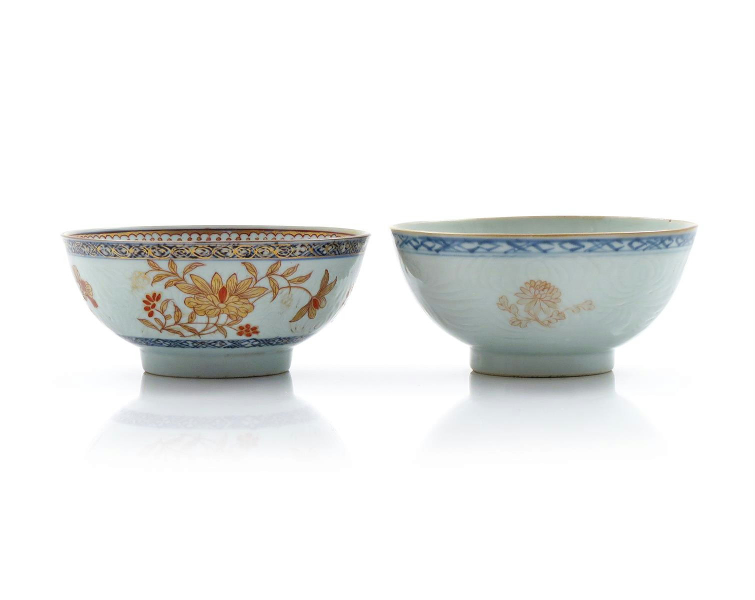 Two Chinese porcelain bowls 1st half 18th century, each with anhua decoration of flower scrolls, between narrow hatched borders in underglaze blue, one simply enamelled in China with three small chrysanthemum sprigs in red and gilt, the other London-decorated with three large peony sprays in a heavier version of the same palette, a crowsfoot border added to the interior, 15cm. (2)