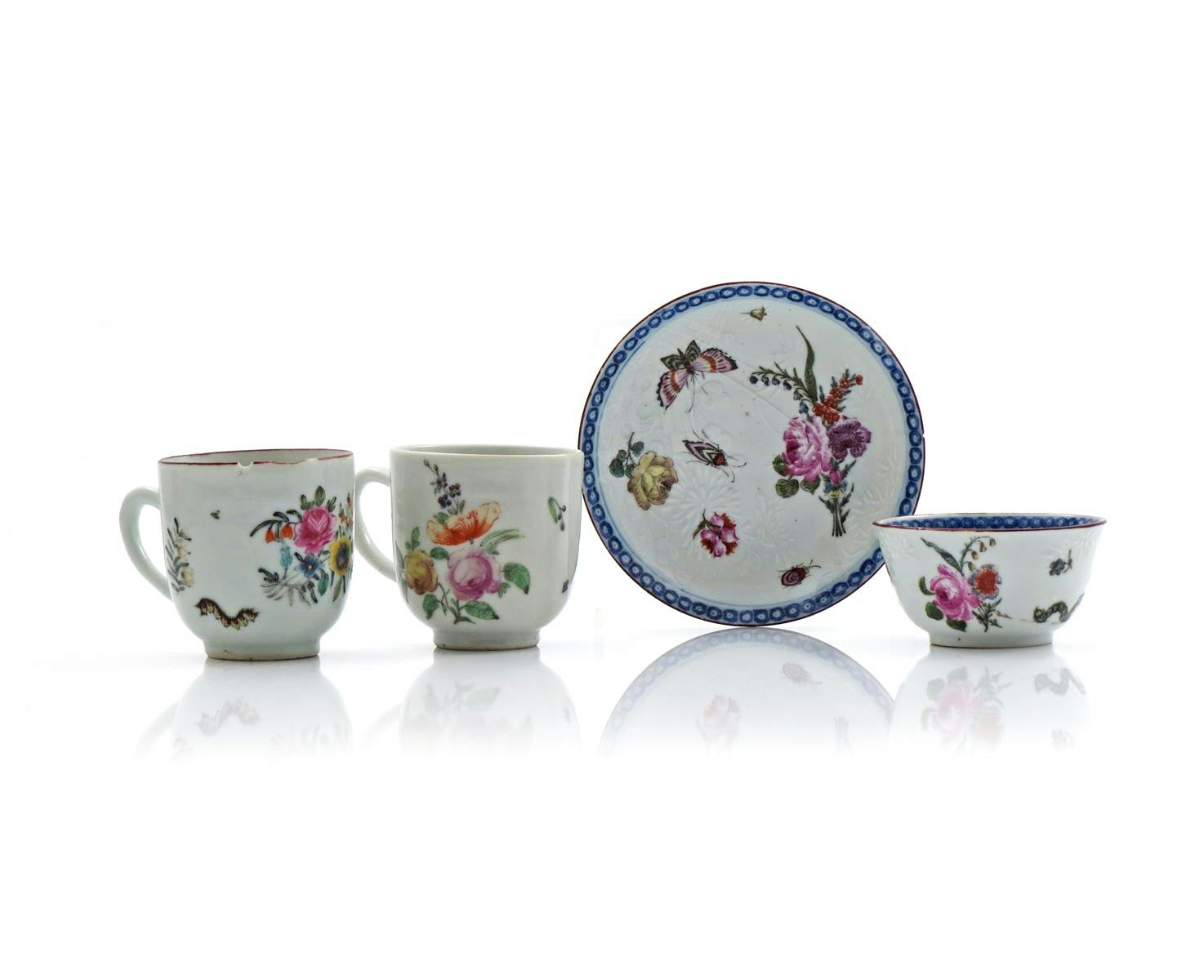Floral decoration by the London ateliers falls into two categories, as originally defined by Bernard Watney and detailed by Stephen Hanscombe in his book, The Early James Giles and his Contemporary London Decorators. The spiky, pencilled manner of the teabowl and saucer and one cup is indicative of Type A, while the rounder petals and red-dotted caterpillar are classified as Type B. There has been much discussion about the attribution of each type of decoration to differing workshops, but Stephen Hanscombe remained of the opinion that both types were largely the work of the Giles atelier.