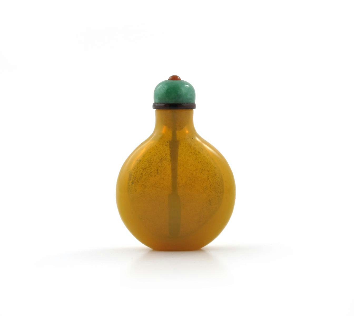 A Chinese Beijing glass snuff bottle 18th/19th century, the compressed circular body an even mustard-yellow tone, the stopper formed from jadeite, 6.3cm.