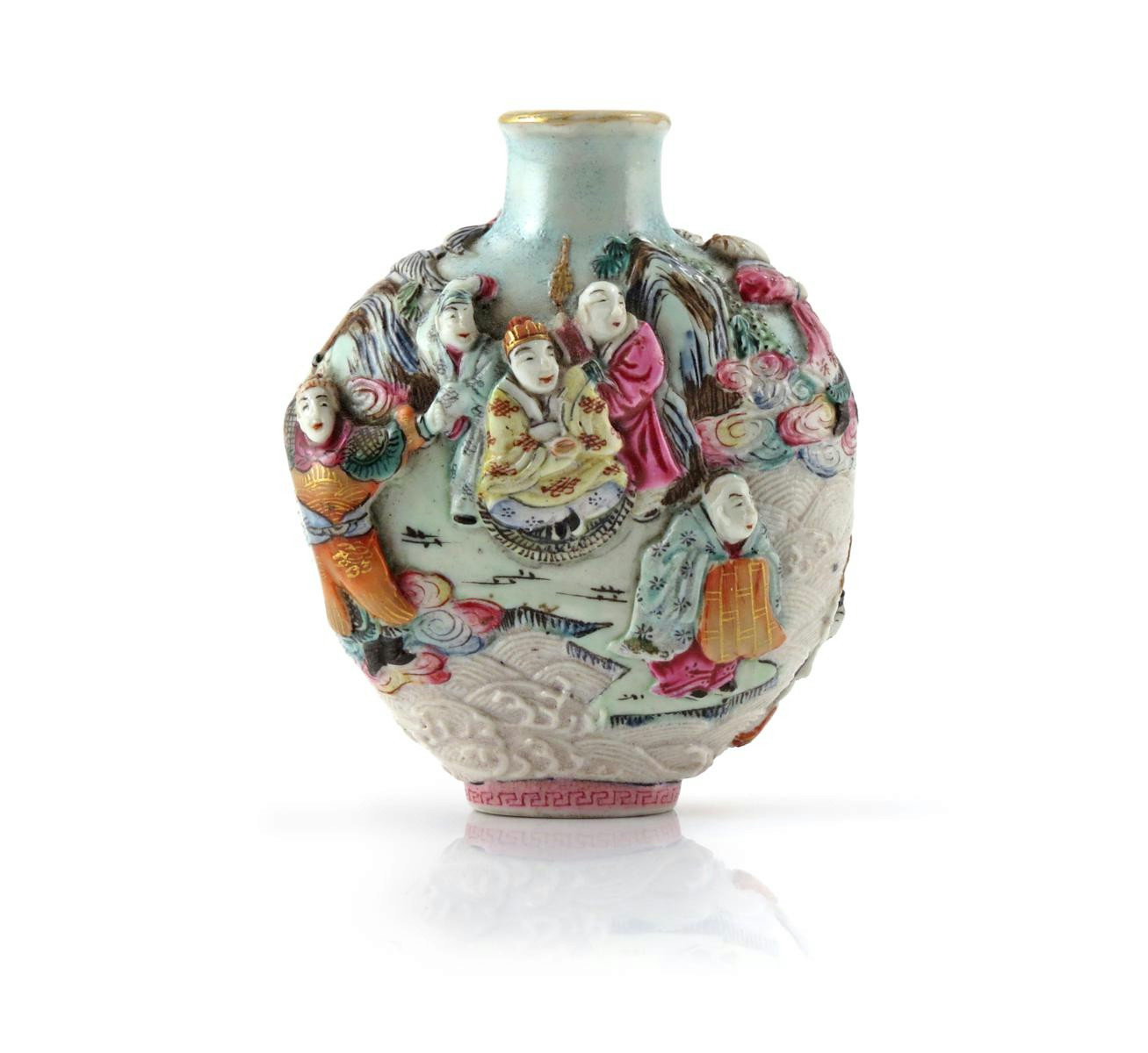 A Chinese moulded porcelain snuff bottle 19th century, depicting figures on a small boat above breaking waves, the base with a four character Qianlong mark in iron-red, 6.5cm.