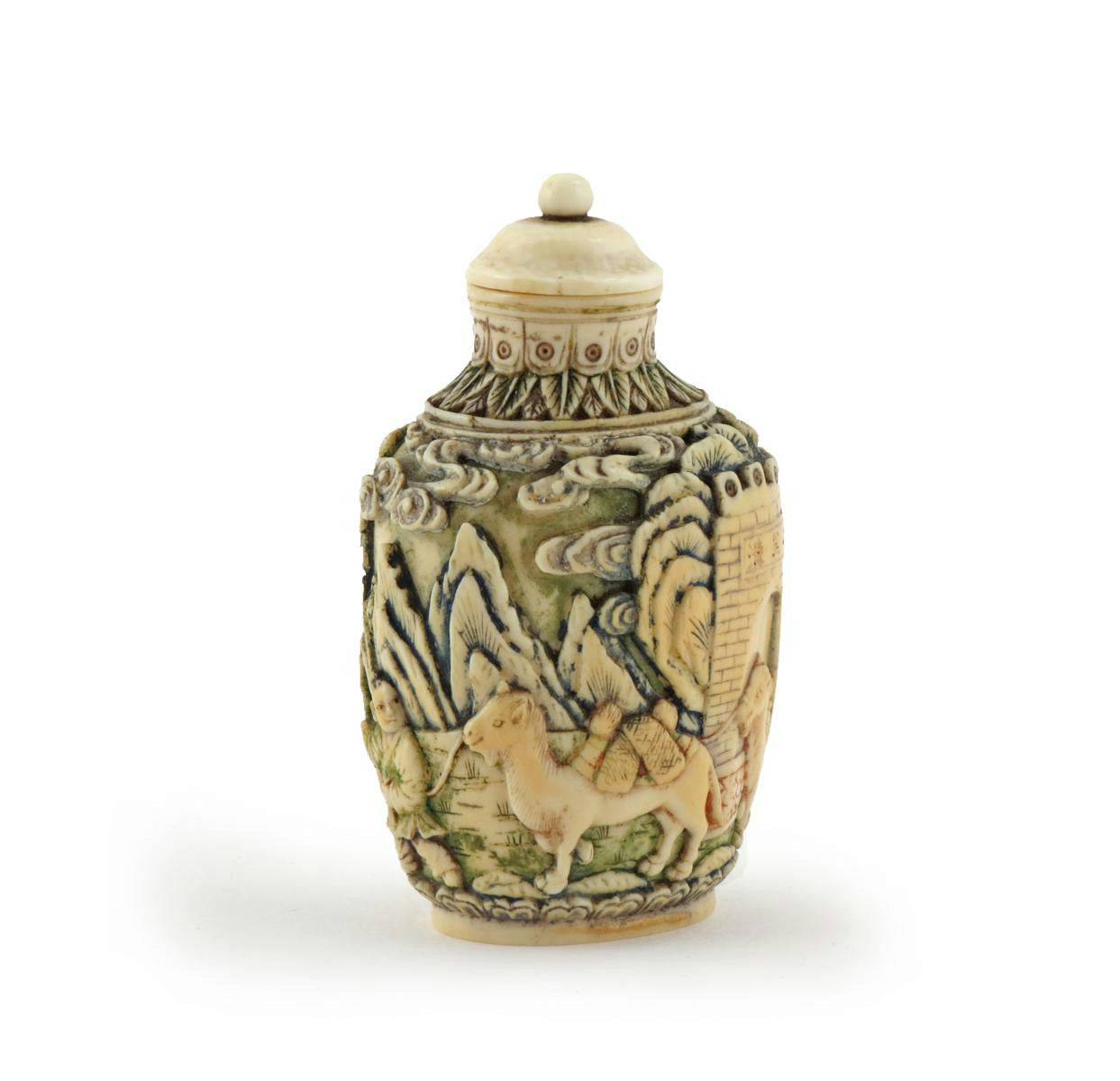 λ A Chinese ivory polychrome snuff bottle 19th century, carved in relief with two traders leading camels through the Er Li Gou Gate, before a rocky landscape with pine trees, between bands of lappets and stiff leaves, 7.5cm.