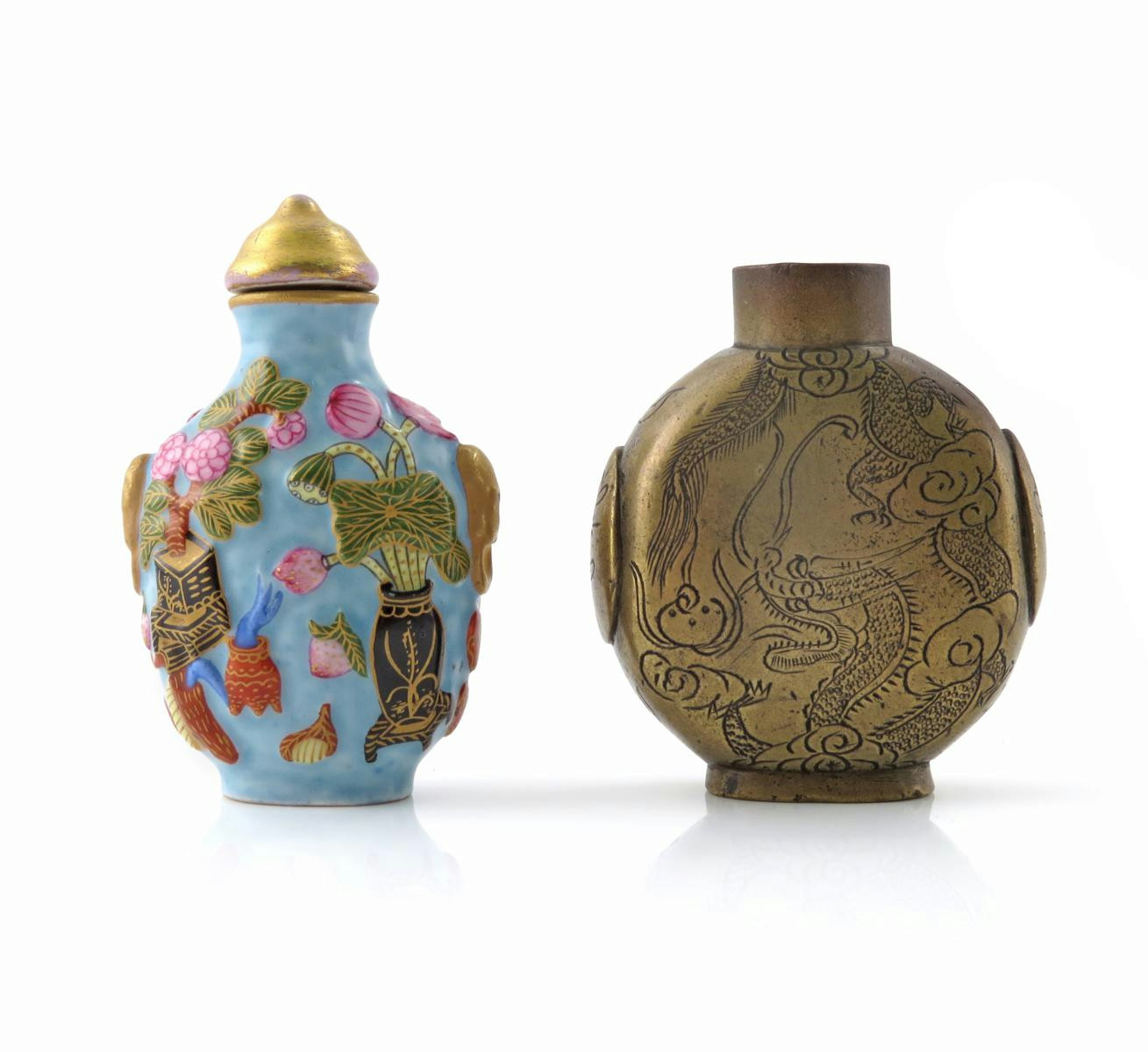 Two Chinese snuff bottles 19th century, one in gilt bronze decorated with a dragon and a flaming pearl of wisdom to each side, the other porcelain, decorated with vases of lotus flowers and leaves, a four character Daoguang mark to the base, 6.8cm. (2)