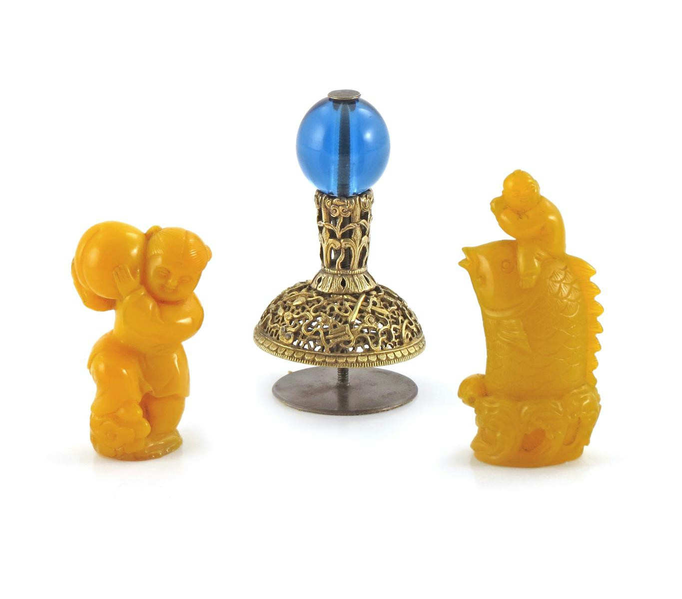 A Chinese gilt metal hat finial 19th century, reticulated with cloud scrolls and auspicious objects, surmounted by a blue bead, together wtih two yellow glass carvings, one depicting a large fish emerging from water, a small boy sitting on its back, the other a boy holding a large peach, the base carved as a seal, 10cm. (3)