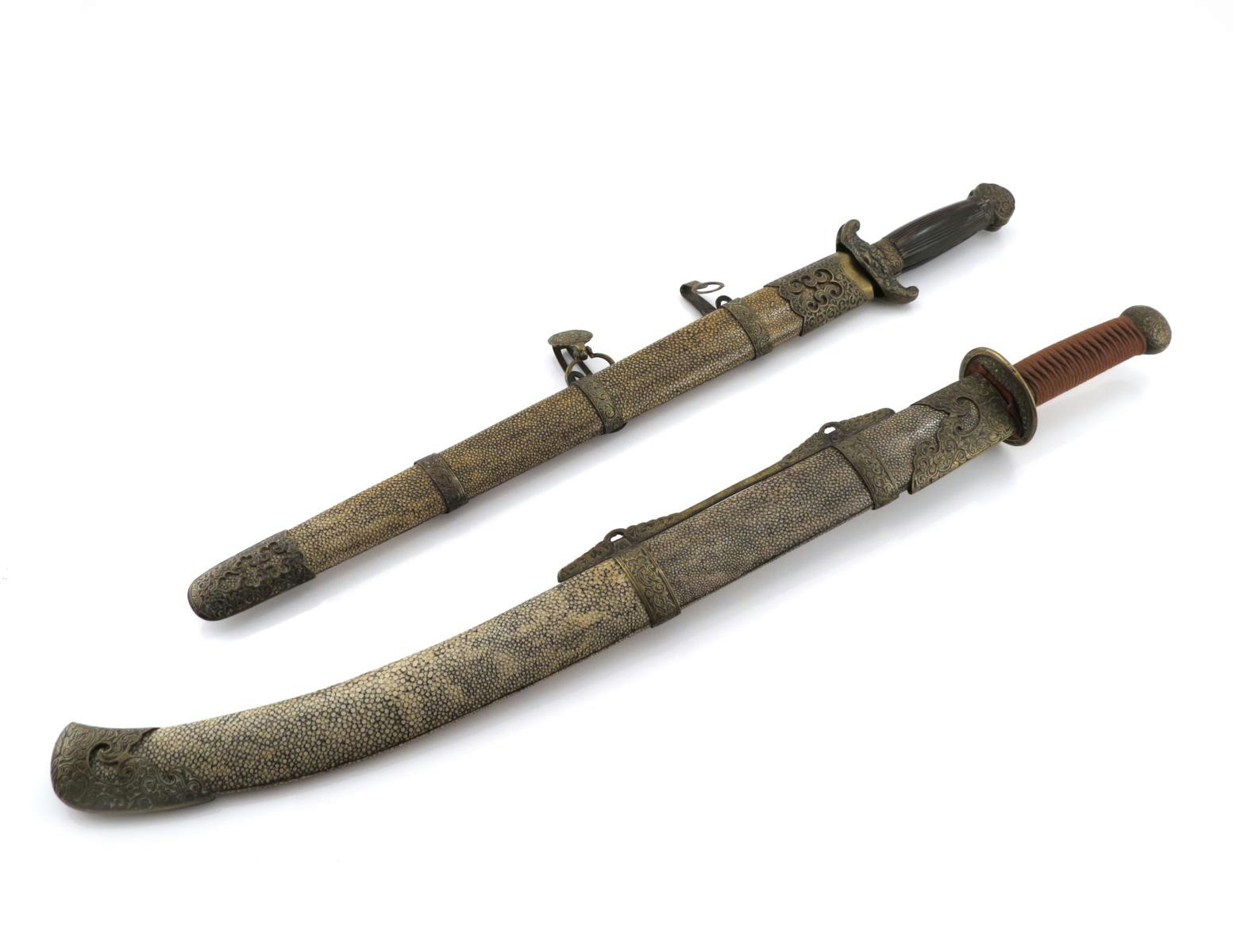 Two swords 19th/20th century, the double sword Chinese, the other Japanese, both with brass-mounted shagreen scabbards, 75cm max. (3)