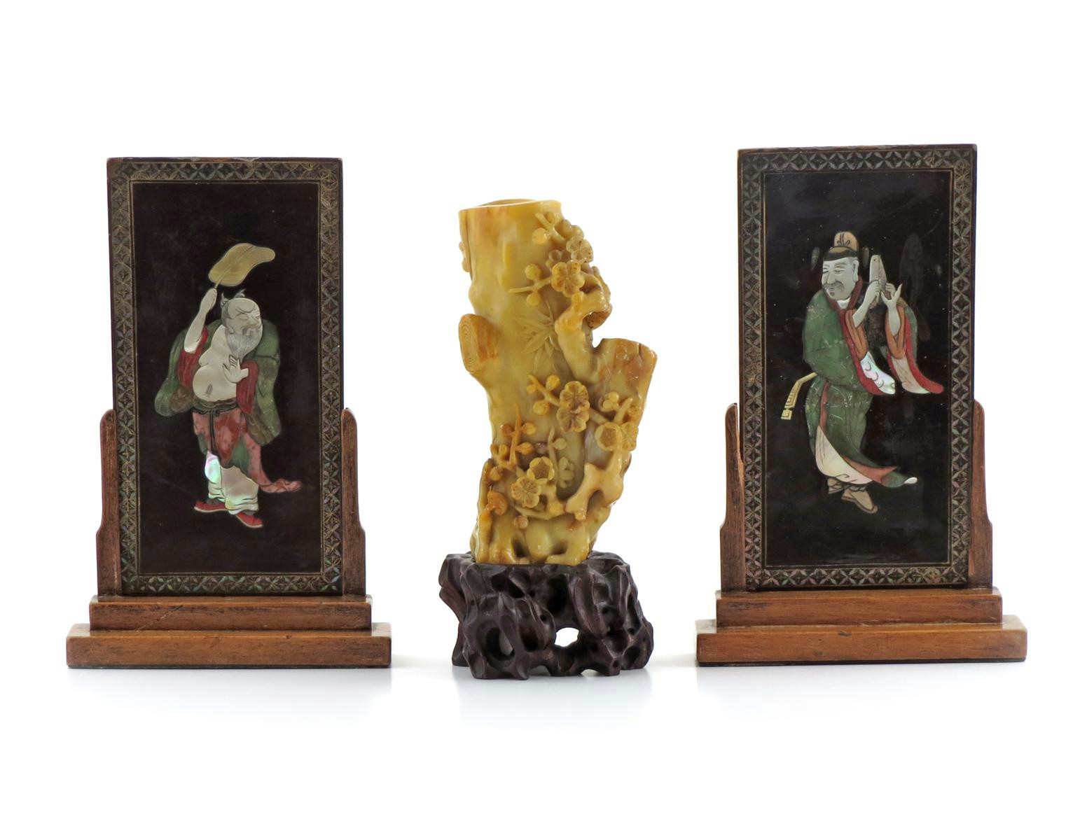 A pair of Chinese lacquer table screens 19th century, each decorated in mother of pearl and soapstone with an Immortal, the reverse with a poem, each with a wood stand, and a large soapstone vase, carved as a gnarled tree branch issuing flowering prunus, bamboo and lingzhi, together with a reticulated hardwood stand, 27.9cm max. (6)
