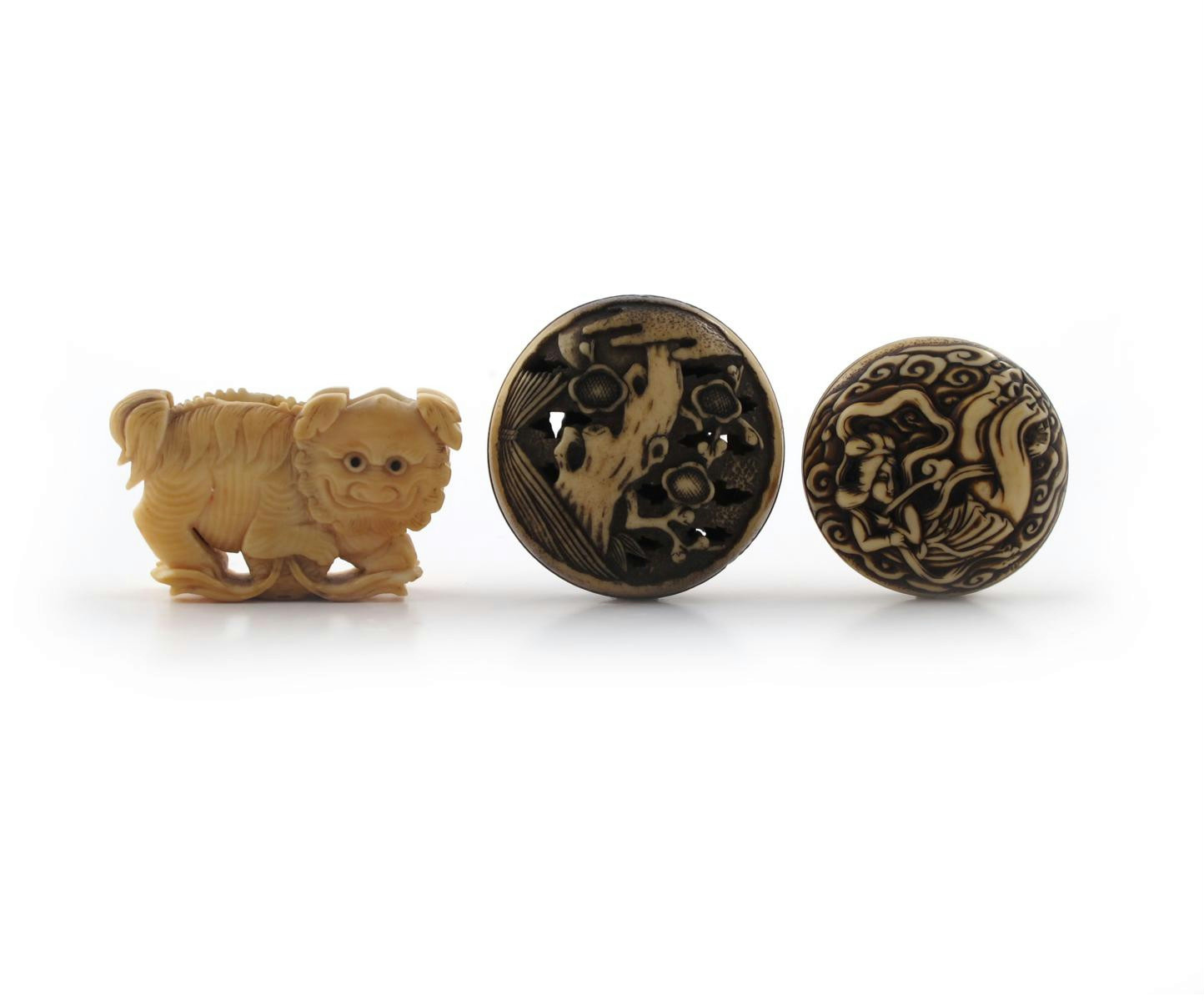 λ Two Japanese ivory netsuke 19th century, one a manju carved with a tennin floating before cloud scrolls, the reverse with lotus flower and pods amongst stylized waves, the other a stag antler ryusa with a flowering prunus under the moon, the reverse with pine and bamboo, with an ivory carving of a shishi dog, unsigned, 4.4cm. (3)