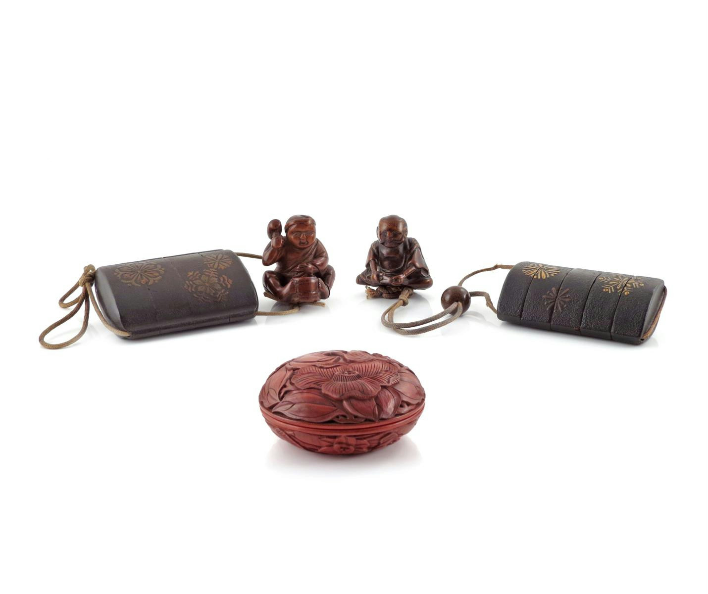 Two Japanese lacquer inro 19th century, one with four cases, the other five, each decorated with gilt flowerhead mons and with a bamboo netsuke joined by a cord, carved as a seated figure, together with a Chinese red cinnabar lacquer circular box and cover, carved in shallow relief with flowering magnolia, 7.9cm. (4)